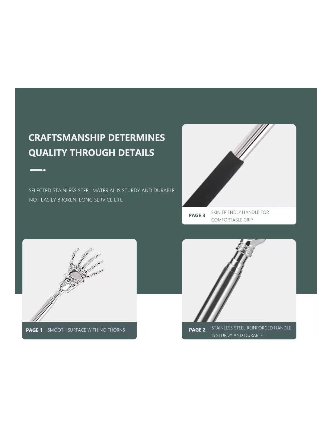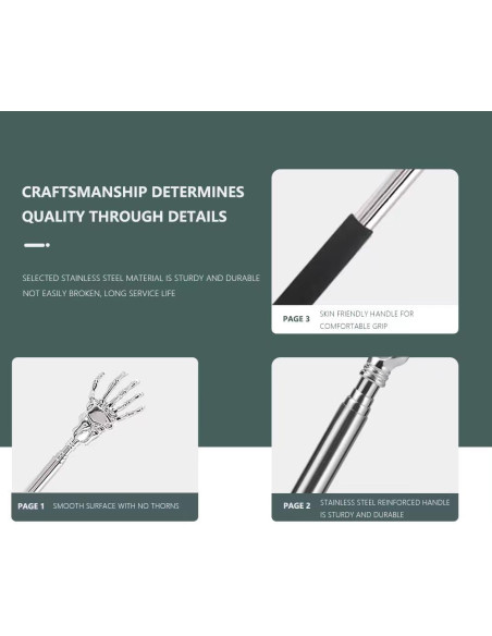 Rascadorde Espalda Telescópico de Acero Inoxidable es adecuado para otras partes de la espalda, la cabeza, las piernas y otras partes del cuerpo, y efectivamente le ayuda a resolver el problema de picazón. Compacto y ligero cuando se pliega, perfecto para viajar o para la vida diaria.
